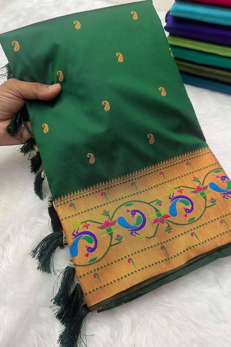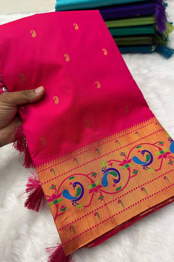 This soft Pethani silk saree exemplifies timeless elegance with its luxurious texture and exquisite craftsmanship. The saree is adorned with intricate gold zari weaving throughout, creating a shimmering effect that adds to its allure. The border of the saree features a delicate Munia design, enhancing its traditional appeal. At the pallu end, delicate tassels are attached, providing a graceful finishing touch.