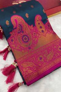 The saree is adorned with intricate copper zari weaving, creating stunning motifs that are spread gracefully all over the saree. The pallu is richly designed with extensive zari weaving, adding a touch of opulence and sophistication. Featuring a contrast border with zari weaving, the border enhances the overall appeal and adds a striking visual contrast. Elegant tassels are attached at the end of the pallu, adding a playful and stylish finish. Perfect for special occasions, this saree combines traditional artistry with modern aesthetics.